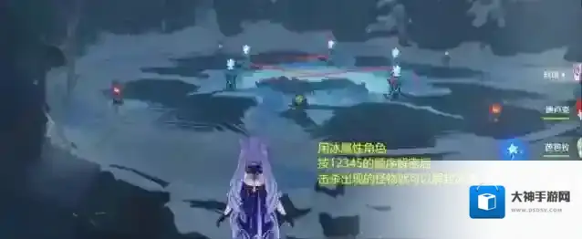 使用冰元素角色,按照下图所示序号的顺序触发机关,击败怪物就可以了。