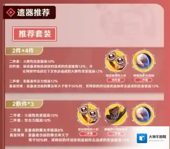 姬子的遗器套装还可以选择熔岩锻铸的火匠、野穗伴行的快枪手和停转的萨尔索图的二加二加二组合,可以作为姬子的过渡遗器组合。
