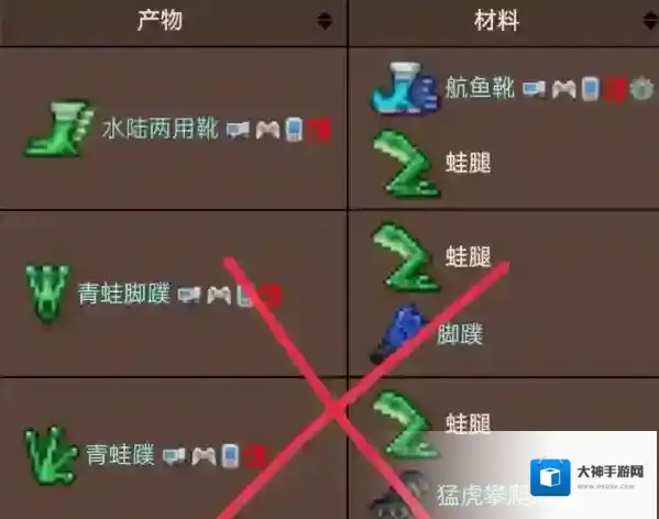 当你钓的蛙腿以后,就与木匣开出来的航鱼靴合成大爹水陆两用靴,反正别合另外两个,性价比极低不推荐(并不是必需品,可以不要,这个饰品强度很高但需要钓鱼所以花费时间不定,十分推荐整一个)