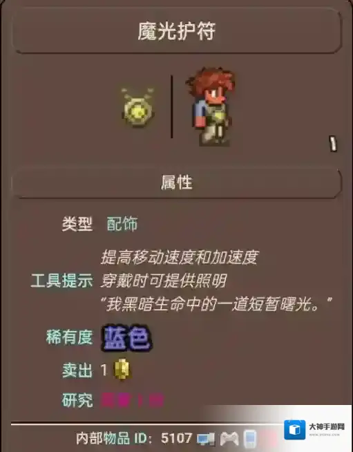 魔光护符:+20%移动速度 -50%停止移动后的惯性 -50%奔跑时达到所需时间 提供照明