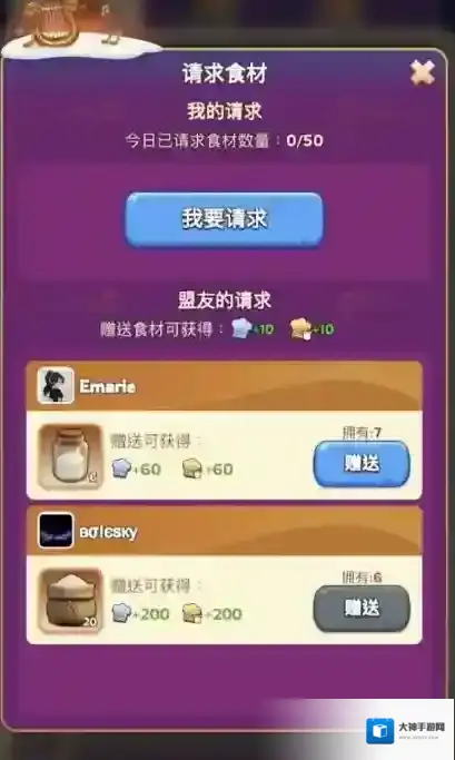 还有一个乞讨食材的端口,每天每个人都可以向盟友乞讨50个食材。这个就看你们盟内之间的关系了。关系不好的话,那你一个也讨不来,那关系要好的话,每天能多给你50个食材,想要什么给什么。