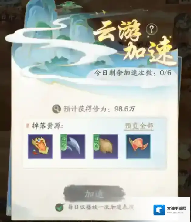 云游加速:若道友们希望快速提升,云游加速将助您一臂之力!在云游收获包裹下方,点击“云游加速”图标,即可立即获得一小时的云游掉落资源。云游加速分为无消耗和消耗造化两种。提升功法和古宝的养成度可以增加免费加速的次数,提升角色境界可以增加消耗造化加速的次数上限。