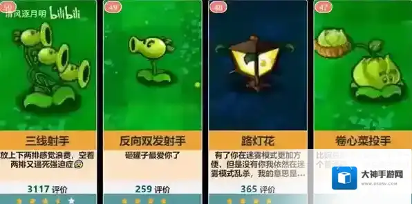 54、仙人掌:2249评价,紫卡根本就是超模的存在,白卡最强大概是三线,还得考虑种边路的性价比。机枪就不需要了,玉米加农炮就是个多次性灰烬植物,甚至有个猫尾草就能取代双向和仙人掌的功能了!