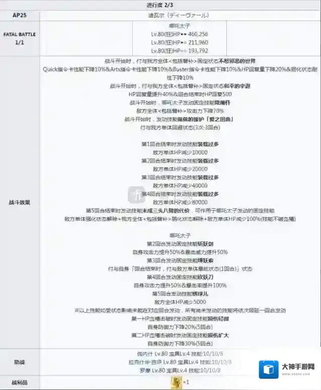 本节的难点就是我们熟悉的哪吒三太子了,因为是变为了狂阶,所以对于我们还是有点威胁的,值得注意的是,比较少见的再次出现了难度较高的单体敌人,可以看出运营有些要抬单体从者的倾向了,所幸三太子是狂阶,所以基本上什么职阶的高宝单体从者都可以上,大家可以根据自己的box来加以应对。