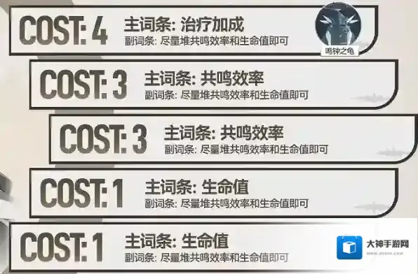声骸主词条方面,cost4选择治疗加成,cost3选择共鸣效率,cost1选择生命值。