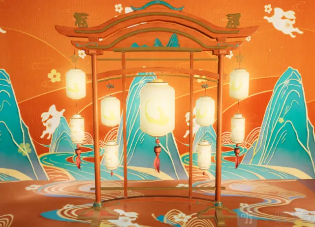 呈红棕色两只兔子背对背坐在灯笼架的上,沿灯笼上绘了一只小兔坐在弯弯的月上,点亮灯笼庄园顿时灯火通明,一起迎接兔年的到来