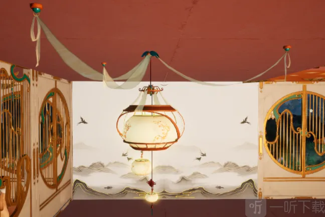 米色的丝绸将玉兔庆典吊灯悬挂在屋顶上,小灯笼上的梅花栩栩如生,灯笼上的中国结将它与大灯笼串联起来看上去赏心悦目