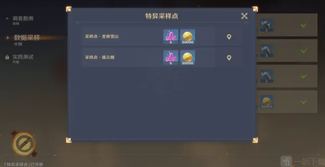 9.在做完第二阶段的采样点之后我们就解锁了特异采样点,分别位于龙脊雪山东山崖下的海湾处,孤云阁中间的小岛上,特异采样点的操作流程等同于活动第一阶段+活动第二阶段(先用探测器找出采样装置,然后用雷元素给采样装置充能)。