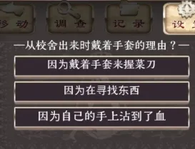 3、在爱丽丝拿出手套后,选择教室的门上的指纹,这里会让玩家选择戴手套是为什么,选择戴手套是为了找东西,能够证明的人还是双子,他们看见了白兔偷拿红桃女王的手机;