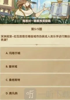 5、深渊摇滚-拉瓦图恩在哪座城市伪装成人类乐手进行舞台表演?奎林城