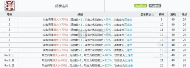 风笛的3技能加成幅度非常的变态,在技能持续期间,风笛的防御力比肩重装干员,输出能力也是十分强悍,而且阻挡数加一,可以说风笛的3技能作为大招十分合格,但是因为3技能的等级提升比较平滑,没有明显的质变,所以专精的优先度还是要略微低于2技能。因为3技能肯定是部署后越早可以释放越好,所以3技能也是很吃精二的初始技力提升天赋的。