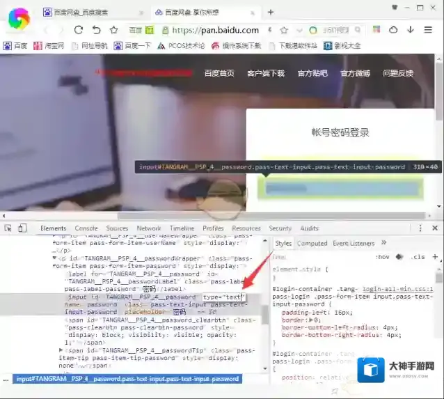 (3)接着在弹出的一堆代码中找到“type=password”,然后双击它并将其改成“type=text”,如下图所示: