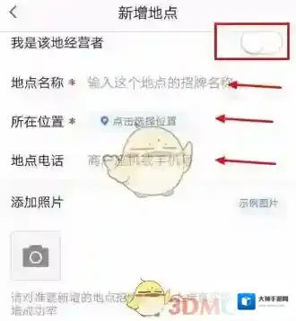 进入新增地点页面,在此页面可以选择是否是该地经营者,输入“地点名称”、选择“所在位置”,输入“地点电话”。