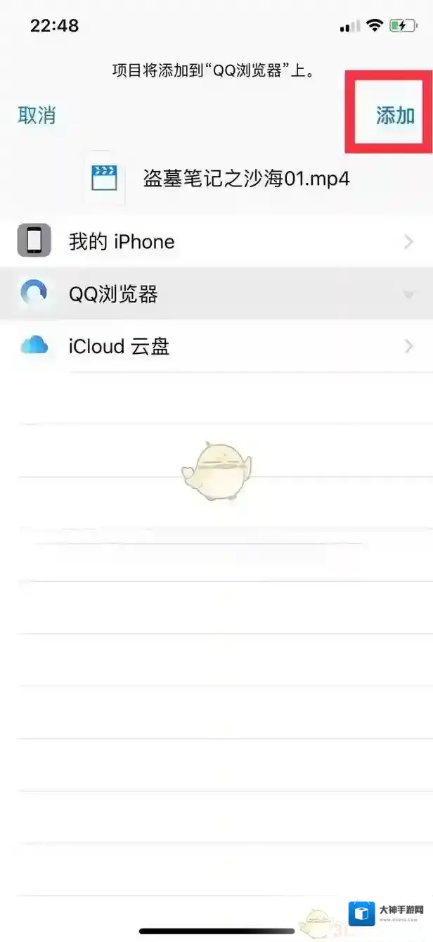这里进入到文件页面,直接点击选中“QQ浏览器”,然后点击右上角的“添加”,这样就大功告成了!