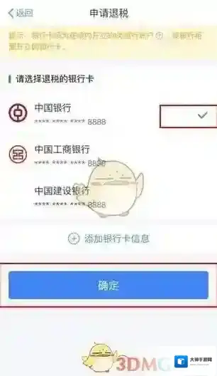 点击申请退税后,纳税人需选择退税银行卡。如前期已添加过银行卡,系统将自动带出已填银行卡信息。您需新增,点击添加银行卡信息-确定。