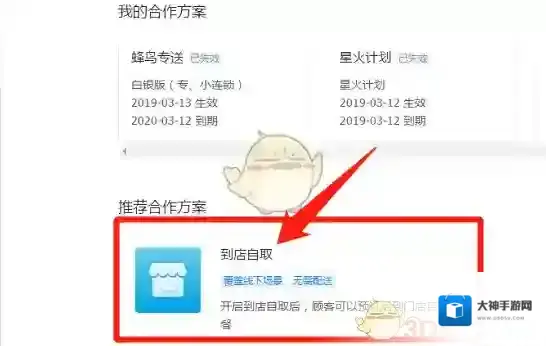 3、进入门店与饿了么平台的现合作方案页面,点击“到店自取”。