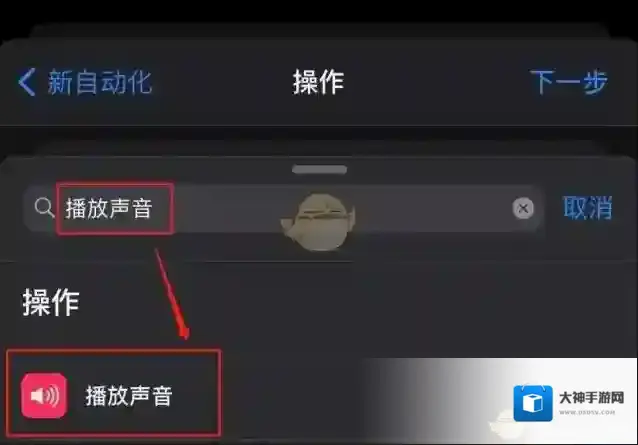12、在底部搜索框中输入播放声音,选择播放声音,并点击右下角三角形按钮。