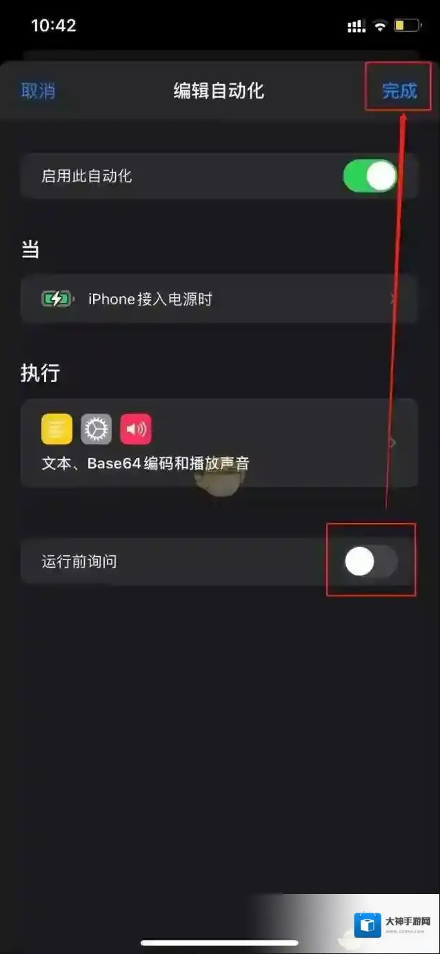 13、点击下一步,关闭运行前询问并点击完成,就可以使用ios14自定义充电提示音啦!
