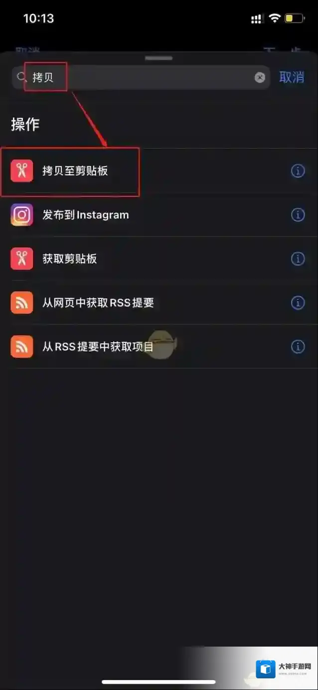 5、在屏幕下方的搜索框中输入拷贝,选择拷贝至剪贴板。
