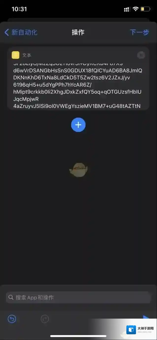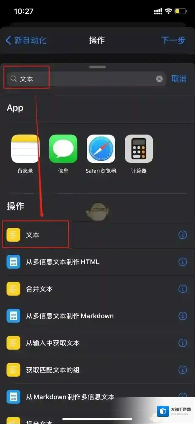 8、点击添加操作,在搜索框中输入文本,并选择文本。