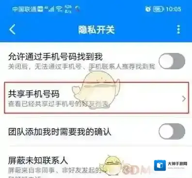 5、在隐私开关的设置页面中,找到共享手机号码的功能选项,点击并进入到该功能的页面中。