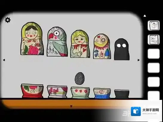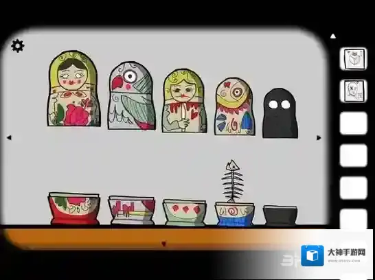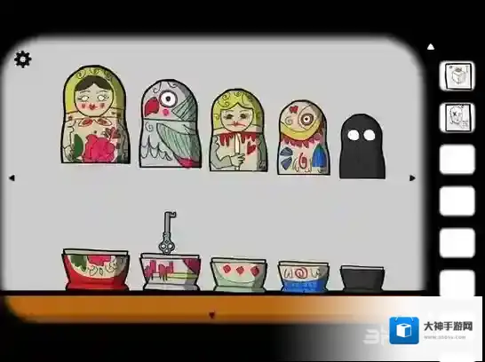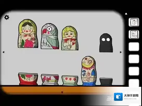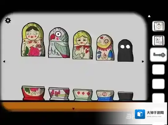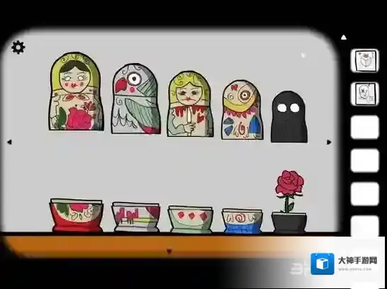 点击柜子中的套娃,依次将它们摆出来。在黑影套娃里是花,把花移到女人套娃上合住,再打开就是鱼,以此类推,最后得到钥匙。