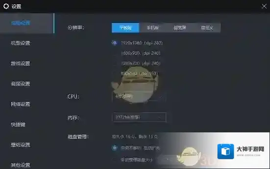 4、在其中可以设置分辨率、cpu、内存、机型、音频、网络、快捷键等参数。