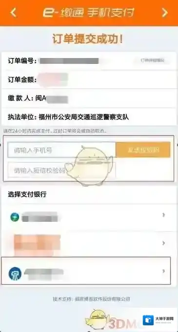 7、此外,在处罚决定书页面下,输入决定书号、校验码,也可对对应违法记录进行缴费操作。根据缴费页面提示,输入手机号、短信校验码、支付卡号与支付密码等信息,即可完成支付。