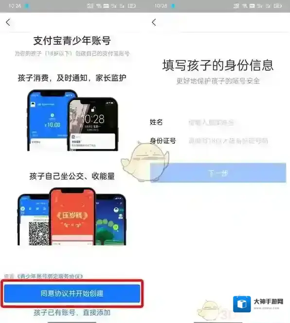 4、你的孩子没有支付宝账号,可以点击同意协议并开始创建,输入孩子的身份证信息进行创建;