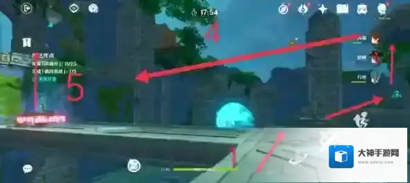 4.朝底部走,底部有挑战。首先朝1处关闭风场,再逆时针如箭头所示收集,挑战完成后改变风场向上飞。