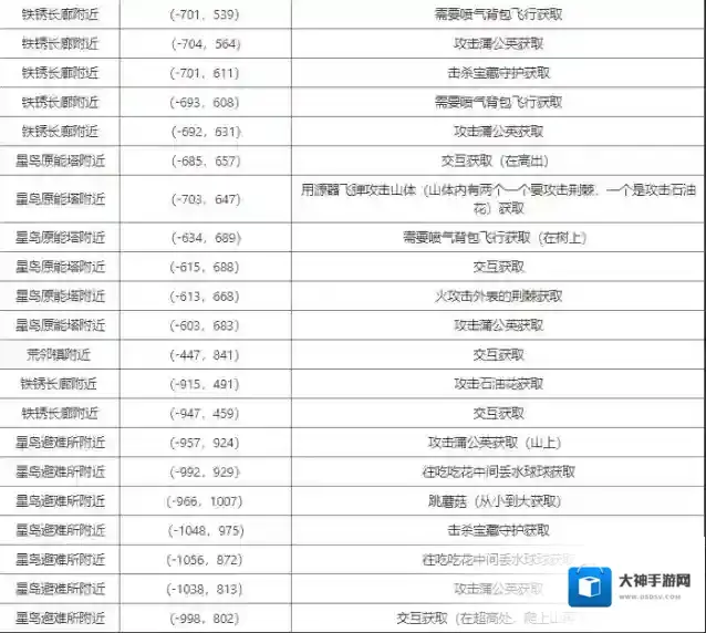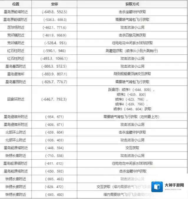 幻塔克星岛搜索全收集攻略 2025-08-07 11:29:44 编辑: 小艾 分类: 手游攻略 • 阅读: 173 幻塔克星岛搜索全收集攻略 星岛全地点地图: 文字版坐标: ①黑核 ②金核位置 怎么看坐标? 幻塔手游相关内容 全部 幻塔地图 幻塔坐标 幻塔星岛 幻塔塔克 幻塔收集 幻塔 幻塔SAM数据库/mode3:群体 幻塔SAM数据库/mode3:群体 幻塔群体 当前授权者身份已验证,whitelist对比成功 /mode3:群体 冒险指令生成 SAM数据库读取中…… >>>关键信息:特立、差异、趋名逐利 幻塔数据库 幻塔信息 2025-10-19 幻塔限时活动渊海留影即将开启 幻塔限时活动渊海留影即将开启 清澄碧暑天,随塔一起潜入绚丽海洋,为拟留下最美的夏日印记~限时活动渊海留影8月16日12:00即将解锁,咔嚓咔嚓拍照留念,一起来记录这个夏天的美好瞬间!+++活动时间+++2023年8月16日12:00-2023年8月3... 2025-10-01 幻塔3.2「龙阙临篁」版本更新公告 幻塔3.2「龙阙临篁」版本更新公告 亲爱的拓荒者: 《幻塔》将于7月5日03:00-06:00进行停服维护更新。更新完成后将开启3.2版本「龙阙临篁」。02:30起冒险选做、冒险挑战的玩法入口与转服功能将暂时关闭。开服的具体时间可能会根据维护情况有所... 2025-09-16 幻塔薯条怎么做 制作配方分享 幻塔薯条怎么做 制作配方分享 幻塔薯条怎么做 薯条:20饱食度 1白薯:班吉斯灌木周围 1沙拉酱:星岛班吉斯食材商人 2025-09-15 幻塔食材怎么获取 食材所有获得途径汇总 幻塔食材怎么获取 食材所有获得途径汇总 玩家如果需要进行烹饪的话,就必须要拥有对应的食材才能做菜,尤其是高等级的配方需要更高品质的食材,所以寻找食材就成为了一件非常重要的事情,这里就介绍下具体的方法。 幻塔食材 1.从地图上直接拾取,如生菜、西蓝花 ... 2025-09-09 幻塔【捏脸分享】渡边 幻塔【捏脸分享】渡边 捏脸分享渡边 形象ID:496346 体型:男 使用方法:捏脸界面左下角,点击“导入"输入形象ID,即可导出捏脸! 2025-09-05 幻塔多重飞弹怎么样 武器属性强度介绍 幻塔多重飞弹怎么样 武器属性强度介绍 作用:多重飞弹在战斗中的使用还是比较少的,但是在副本的一些关卡以及探索的过程中,有些道具奖励是需要利用飞弹才能击破,比如有些黑核藏在岩石里面,就可以利用多重飞弹来将岩石击碎。 属性介绍: 评分:SR 类型:攻击性... 2025-09-05 幻塔梅洛改造计划怎么做 任务完成流程攻略 幻塔梅洛改造计划怎么做 任务完成流程攻略 1、梅洛位于白鲸岛,坐标:(-534.9,-926.5)具体位置如图所示。 2、通过折跃门传送到白鲸岛,往前一直走,通过大帐篷,在第二个帐篷的前面就能找到梅洛。 3、最后找到梅格对话即可触发。 2025-09-05 幻塔星岛原能塔上层怎么去 前往方法分享 幻塔星岛原能塔上层怎么去 前往方法分享 1、我们先跟着任务指引来到原能塔下面,然后可以看到两边都有不断移动的装置,类似升降台; 2、等升降台下来之后,我们立刻站上去,然后即可乘坐升降台到达原能塔的上层了; 3、此装置就是一种电梯,不管是否有人它都会不... 2025-08-26 幻塔3.1版本 | 相逢夏月满 | 现已开启 幻塔3.1版本 | 相逢夏月满 | 现已开启 ⭐往昔与现刻,拟态明景登场,拟态剧情任务同步上线。 ⭐九域离州将开放新区域云霄山庄,瑞兽金乌也被晦暝能量侵蚀而化作暝伥·玄鸦。 ⭐相逢夏月满版本累计登录7天,即可获得限定10抽、1000墨晶与堡垒装备自选... 2025-08-25 发表回复 请登录后评论... 登录后才能评论 评论列表 ( 0条)