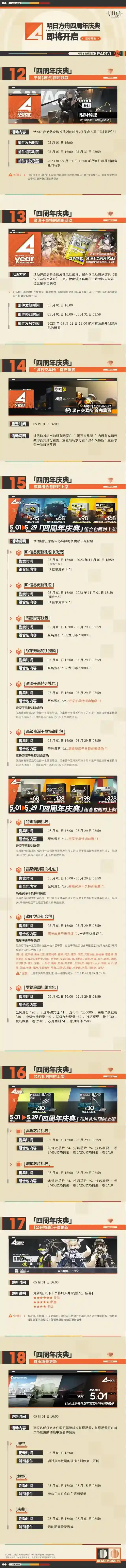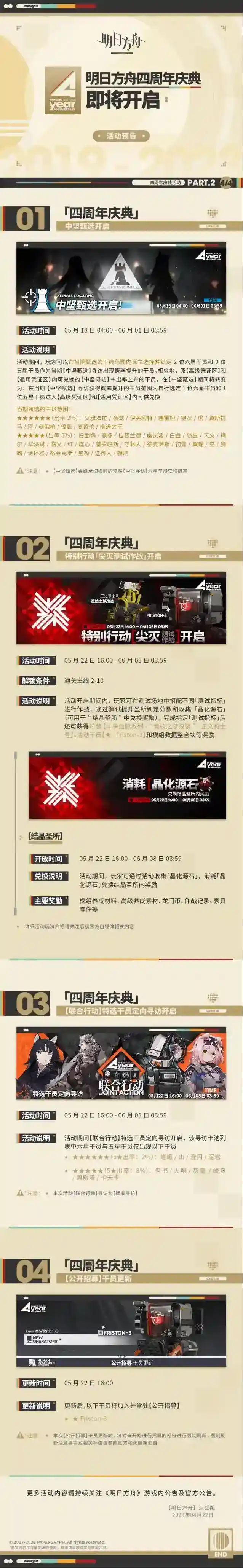七、「四周年庆典」,新装 复刻时装限时上架八、「音律联觉」,新装 复刻时装限时上架九、「四周年庆典」,罗德岛风尚回顾限时开启十、「四周年庆典」,新增主题家具限时获取十一、「四周年庆典」,潘尼谷矿区限时开采许可十二、「四周年庆典」,干员暴行限时领取十三、「四周年庆典」,资深干员特别调用活动十四、「四周年庆典」,“源石交易所”首充重置十五、「四周年庆典」,庆典组合包限时上架十六、「四周年庆典」,芯片礼包限时上架十七、「四周年庆典」,公开招募干员更新十八、「四周年庆典」,首页场景更新四周年庆典活动 Part.2一、「四周年庆典」,中坚甄选开启二、「四周年庆典」,特别行动「尖灭测试作战」开启三、「四周年庆典」,联合行动特选干员定向寻访开启四、「四周年庆典」,公开招募干员更新