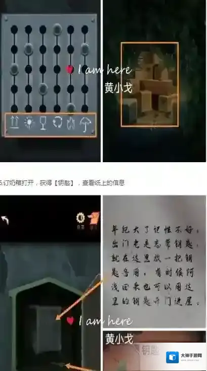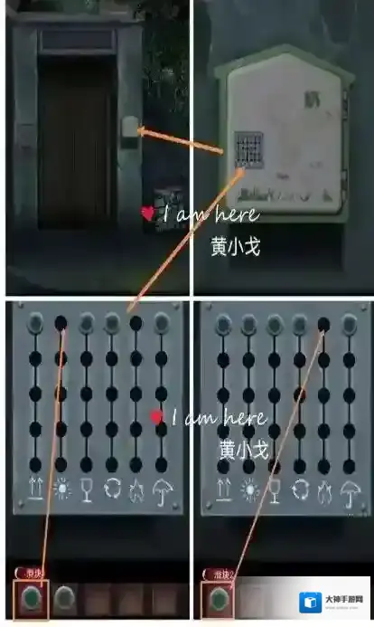25.根据院子里摆放的纸箱子上的图案的位置调整机关上对应图案的滑块的位置(火苗:1、酒杯:2、箭头:3、雨伞:4、太阳:4、循环符号:5)