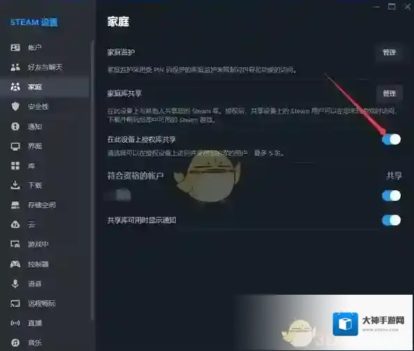 5、在右侧设置聊表里找到在此设备上授权库共享,点击打开右侧的蓝色按钮即可。