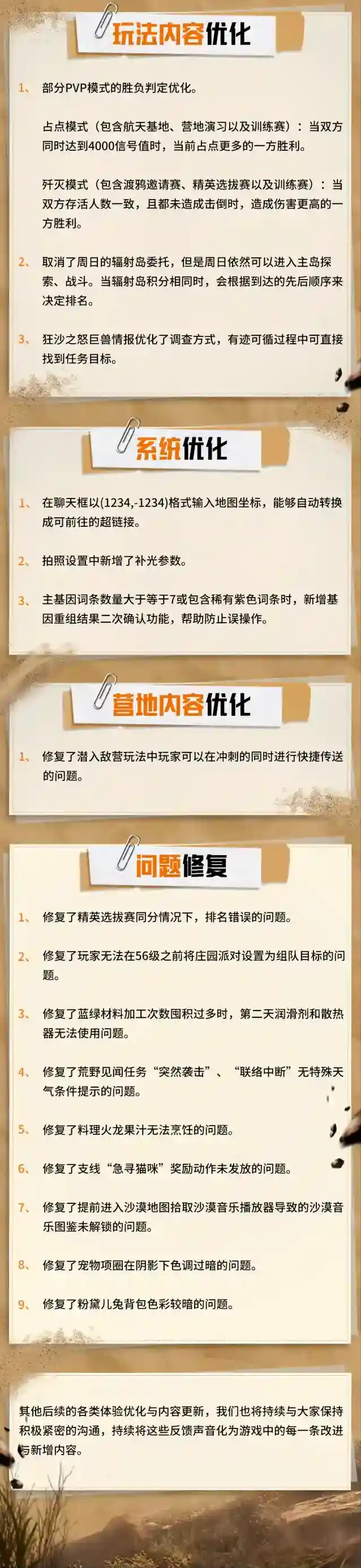 大家好,为了提升大家的游戏体验,我们已于4月26日11:30进行了不停机更新,为了保障您游戏体验顺畅,请您尽快重新登录游戏进行更新。本次维护更新相关内容如下: