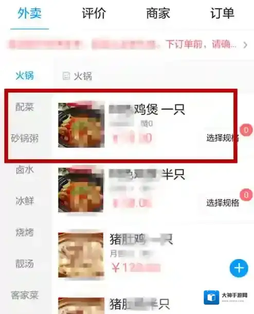 6.选择外卖的界面之后,在左边有一个列表是大分类:粥、砂锅粥、生鲜、烧烤等等。选择一个特色鸡煲一只。选择规格。