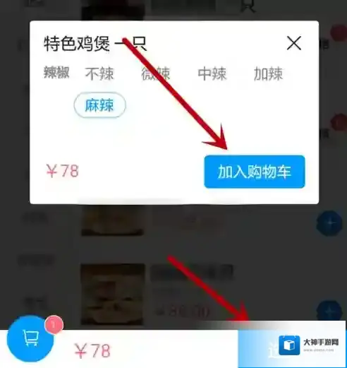 7.点击选择规格之后进入选项中口味的选择:麻辣。选择加入购物车