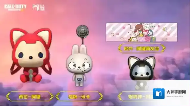 其他奖励此外,在阿狸萌友会幸运箱中,还有背包-阿狸、挂饰-米卡、名片-阿狸萌友会、烟雾弹-阿狸等精美奖励,等待战士们获取。