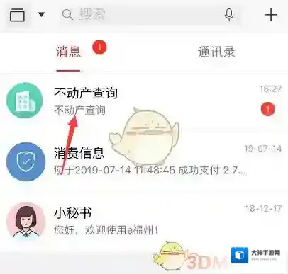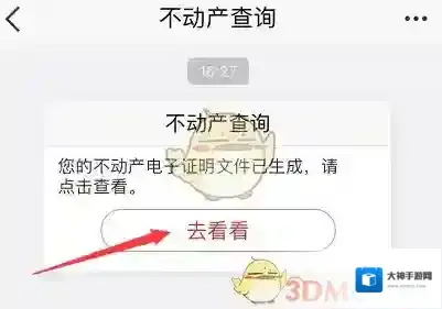 12、在查询申请通过后,不动产状况查询服务会在“e福州”APP的消息栏目中通知查询结果,点击消息内容中的“去看看”按钮,再按前述步骤亦可查看已加盖电子印章的查询结果。
