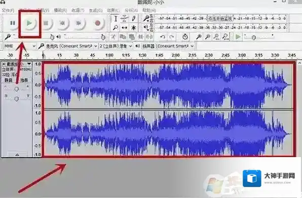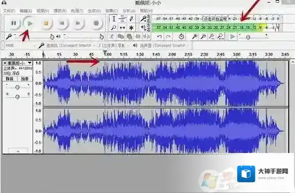 3、点击Audacity菜单栏的播放按钮进行音乐试听,确定好要剪辑的音频时间范围;