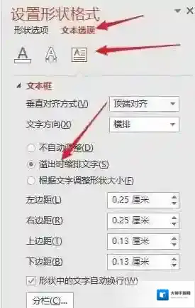 6、在右侧窗口中选择文本选项-文本框-溢出时缩排文字;