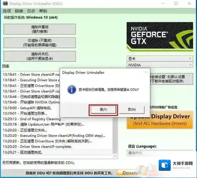 直到提示“显卡驱动已被清理,是否希望退出DDU”,选择“是”,重启电脑之后,我们再安装显卡驱动就可以成功了,在安装过程中就不会弹出“Nvidia安装程序失败”的问题了。