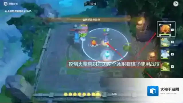 控制火蕈兽对左边两个冰附着的棋子使用战技,可以直接击败左边两个棋子。