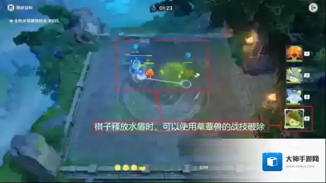 当棋子释放水盾时,可以用草蕈兽或者冰蕈兽的战技破除。