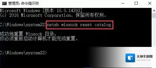 2、当然,也可以使用管理员命令提示符窗口,输入并回车执行netsh winsock reset catalog 命令,完成命令后重启电脑即可成功启用SENS服务;