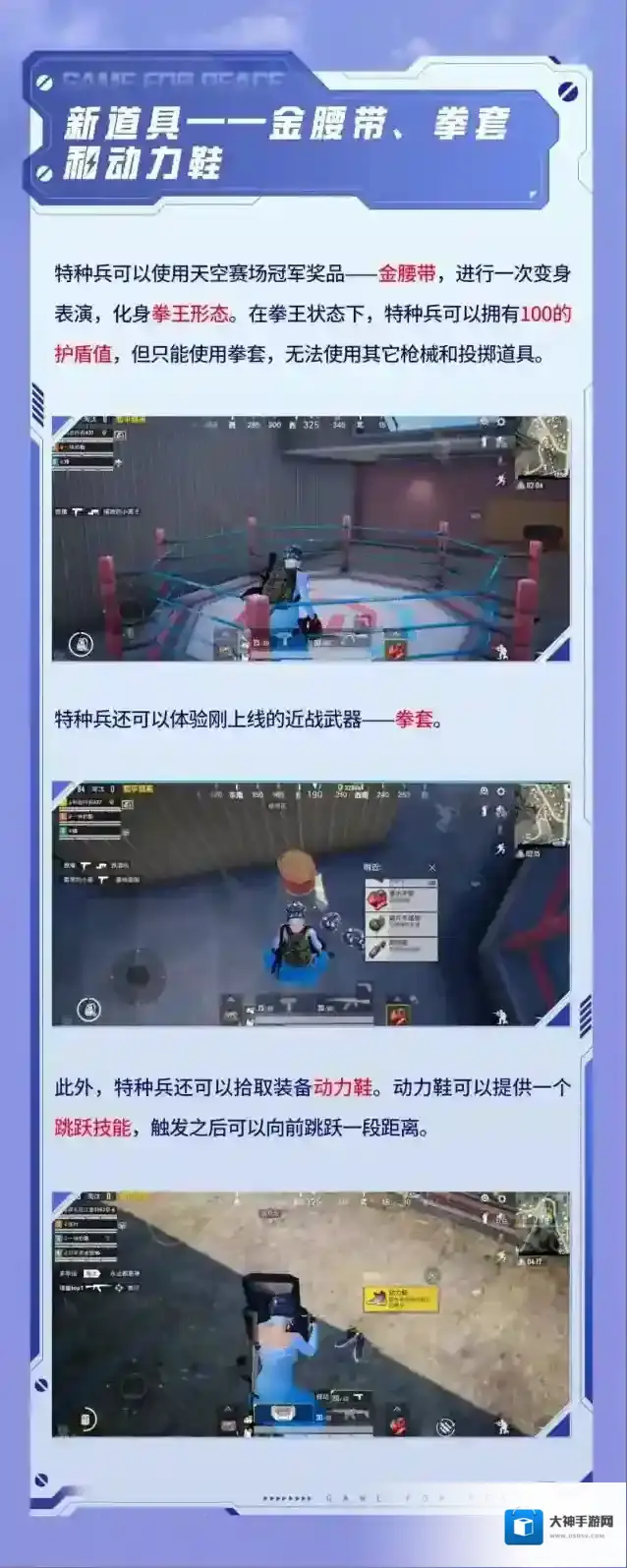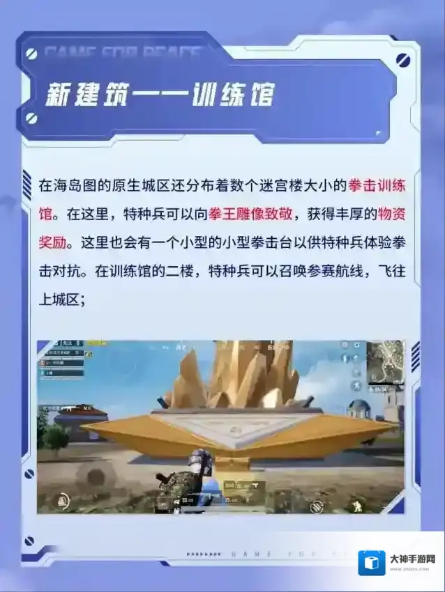 炎炎夏日,激战正酣!《和平精英》天空赛场主题玩法正式上线,此次版本更新给特种兵们带来了全新的地图场景–天空赛场,特种兵可以化身拳击手,击倒对手斩获拳王金腰带;此外,游戏还全新上线了动力鞋、拳套和金腰带等道具。接下来,就让我们一起去体验了解一下这些新颖有趣的内容玩法吧!