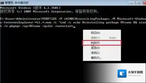 3、在命令提示符中按照不同浏览器版本输入卸载代码,复制起来,在命令提示符框中单击右键,选择“粘贴”,按下回车键即可将其卸载了