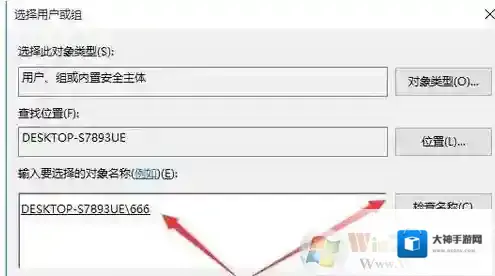 6、在打开的选择用户或组窗口中,在下面的文本框中输入你的账号名称,然后点击“检查名称”按钮,这时会在左侧的文本框中显示出账号的全称,点击确定按钮
