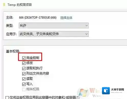 8、在打开的权限项目窗口中,修改用户的权限为“完全控制”,最后点击确定按钮保存退出。