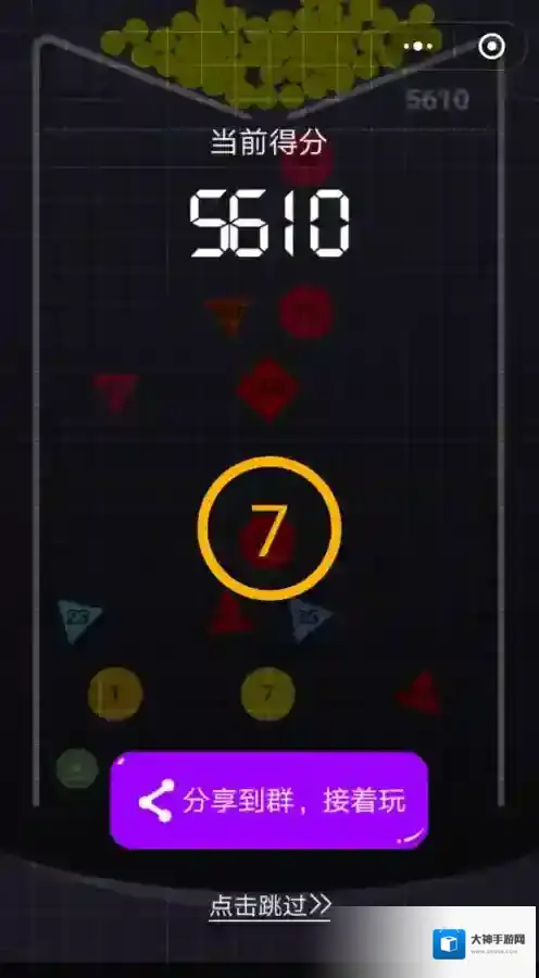 游戏结束后,玩家还有一次接着玩的机会,不过条件就是向朋友圈分享该游戏。分享之后玩家又可以接着玩,这就相当于玩两局,而且分数会进行累计,所以每次结束后分享下,也是一种提高分数的方法。
